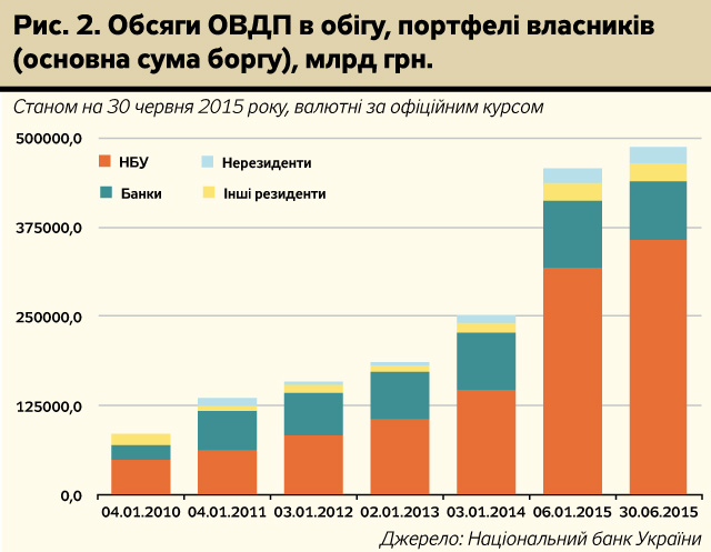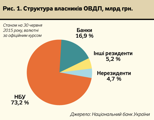 Як результат, ми бачимо постійне зростання портфеля Нацбанку з незначними коригуваннями структури власників на користь банків чи нерезидентів після чергових коливань офіційного курсу гривні до долара США. Так, наприкінці червня майже 73% ОВДП перебували у портфелі НБУ і тільки 16,9% (82 млрд грн) - у портфелі банківських установ. Лише 25 млрд грн облігацій було у портфелях небанківських установ і майже 23 млрд грн (менш як 5%) - у портфелі нерезидентів.