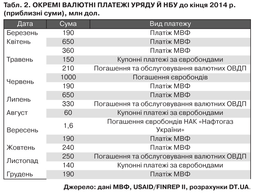 Турбують насамперед валютні зобов'язання, основна маса яких - зовнішні. Другий квартал за платежами більш напружений, ніж перший, через вищезгадане погашення в червні суверенних єврооблігацій на 1 млрд дол. (платежі за зобов'язаннями перед МВФ у першому та другому кварталах однакові - близько 1,2 млрд дол.; з початку року вже виплачено майже 1 млрд дол.).