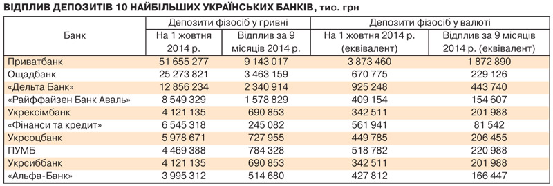Незважаючи на всі часткові обмеження і вербальні вмовляння, відплив вкладів із системи з початку року перевищив 104 млрд грн (переоцінка валютних кредитів через девальвацію не береться до уваги). Крім іншого, більшість "забраних" депозитів усіма правдами й неправдами конвертуються в іноземні грошові знаки, лише підкріплюючи ажіотаж на валютному ринку. У результаті маховик девальвації розкручується, формуючи замкнене порочне коло…