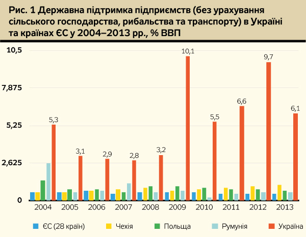 У період 2004–2013 рр. державна допомога бізнесу в Україні (у % ВВП) в рази перевищувала аналогічні показники в країнах ЄС. Під час підготовки до вступу у ЄС та в перші роки членства Польща (1,4% ВВП у 2004 р.), Чехія (2–3% ВВП у 2000–2004 рр.) і Румунія (1,9–2,6% ВВП у 2002–2004 рр.) мали вищі за середні по ЄС обсяги допомоги підприємствам, однак нижчі, ніж в Україні. Якщо держдопомога підприємствам у середньому по ЄС залишалася майже незмінною, то в нашій країні спостерігалася тенденція до її зростання.