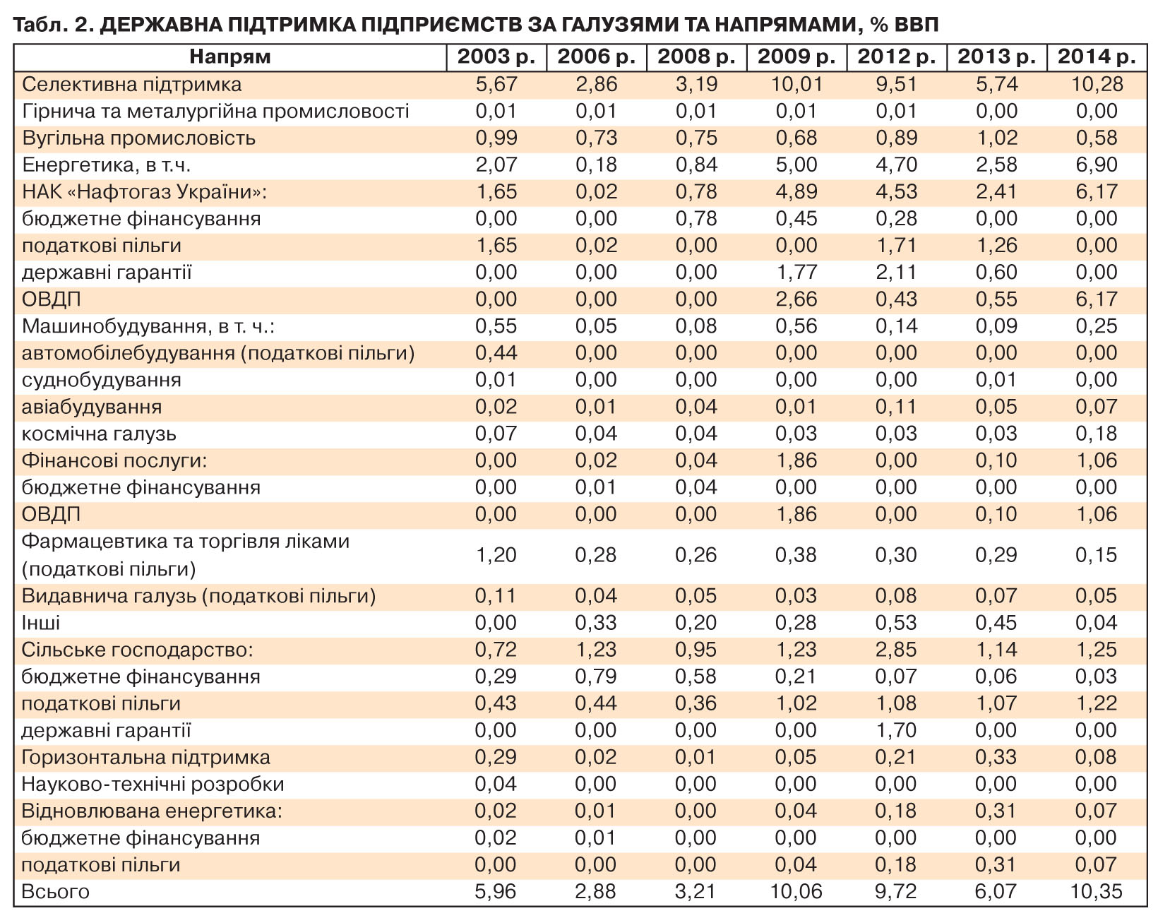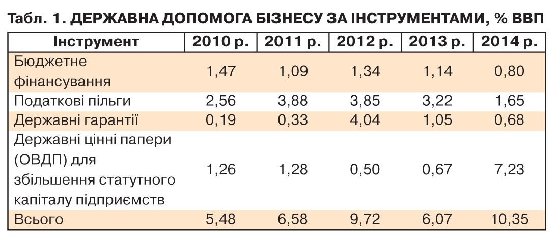 Спостерігається тенденція до поступового скорочення прямого бюджетного фінансування бізнесу (з 1,47% ВВП у 2010 р. до 0,8% ВВП у 2014-му) за одночасного збільшення обсягів наданих податкових пільг (з 2,56% ВВП у 2010 р. до 3,22% ВВП у 2013-му) і державних гарантій (з 0,19% ВВП у 2010 р. до 4,04% ВВП у 2012-му).