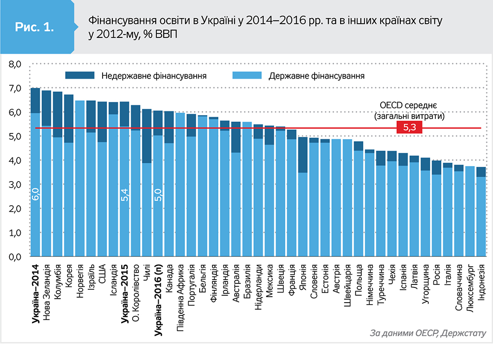 У нашій країні традиційно високий відносний рівень видатків на освіту. Максимальний їх обсяг сягнув 8,2% ВВП у 2009 р. Однак протягом останніх років перед офіційним Києвом стоять виклики консолідації держфінансів, зниження частки держсектору в економіці, в тому числі видатків на освіту. В цих умовах зазначене співвідношення зменшилося до 6,9% у 2014 р. і 6,4% ВВП у 2015 р. У 2016-му прогнозується їхнє подальше зниження до 6% ВВП.