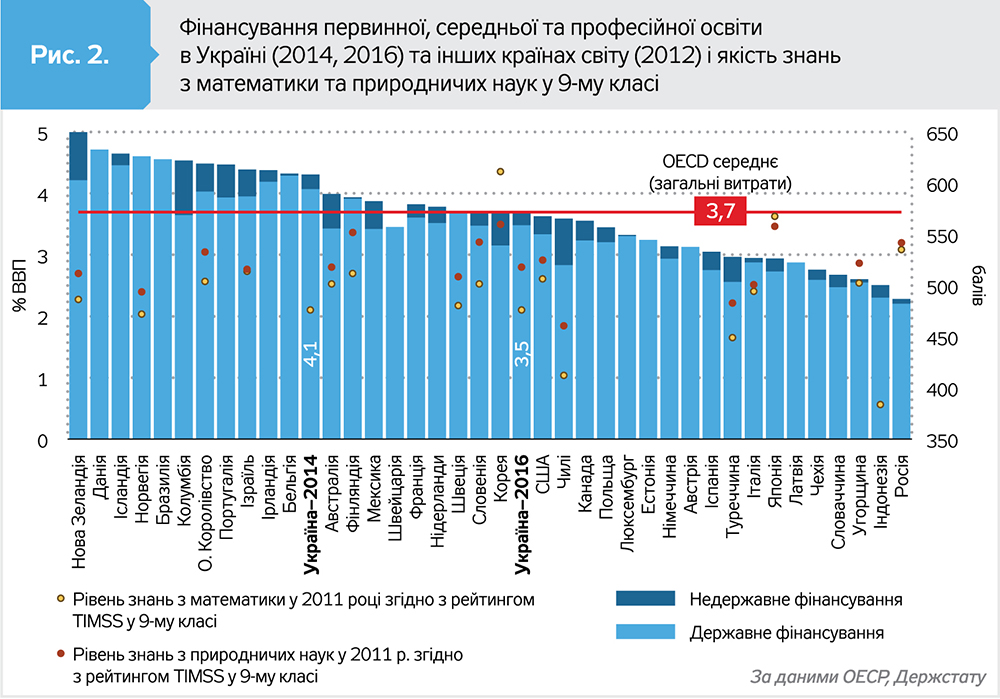 Упродовж останніх років видатки на первинну, середню та професійну освіту в Україні постійно падали - до 4,3% ВВП у 2014 р. Очікується їхнє подальше зменшення до 3,7% у 2016-му, що відповідатиме середньому рівню витрат у країнах ОЕСР. Незважаючи на відносно високі обсяги фінансування первинної, середньої професійної освіти, середній рівень математичних і природничих знань в Україні низький. Відсутність очевидного взаємозв'язку між обсягом фінансування первинної та середньої освіти і рівнем знань з математики та природничих наук свідчить про недостатню ефективність використання фінансових ресурсів в окремих країнах, у тому числі і в Україні.
