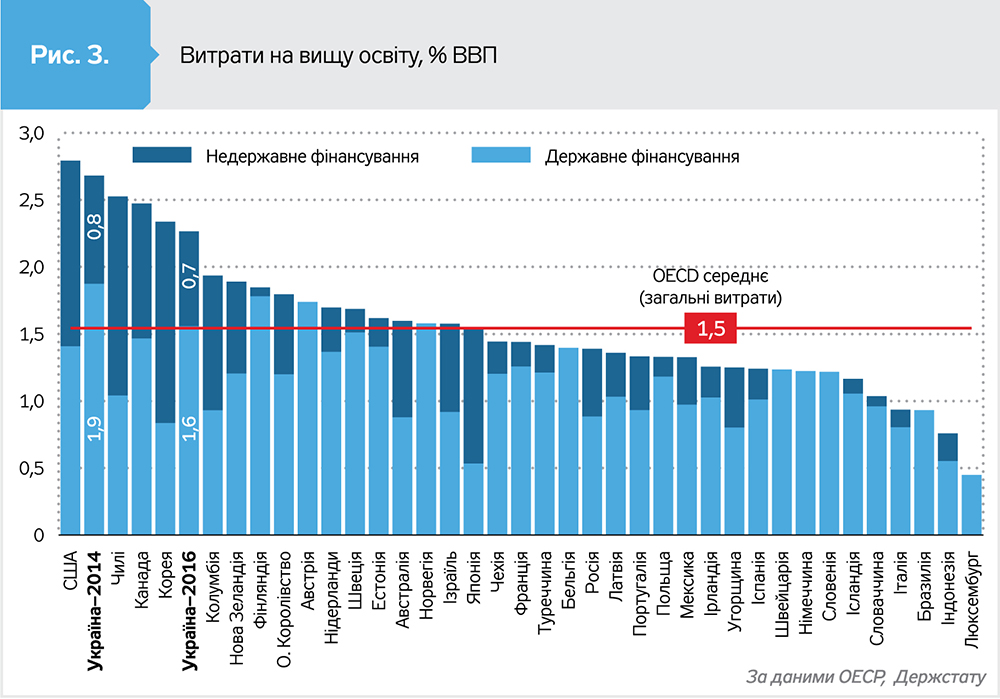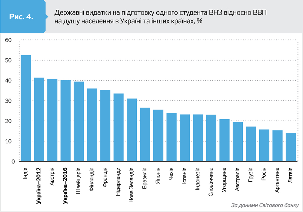 Видатки на фінансування вищої освіти в Україні знизилися з 3,5% ВВП у 2009 р. до 2,7% у 2014-му, і очікується подальше їхнє падіння до 2,3% ВВП у 2016-му. Незважаючи на істотне зменшення державного фінансування, за загальним відносним показником рівня видатків на вищу освіту Україна випереджає Об'єднане Королівство, Нідерланди, Швецію, Ізраїль, Францію, Німеччину і багато інших країн, що посідають значно вищі місця за показником якості вищої освіти.
