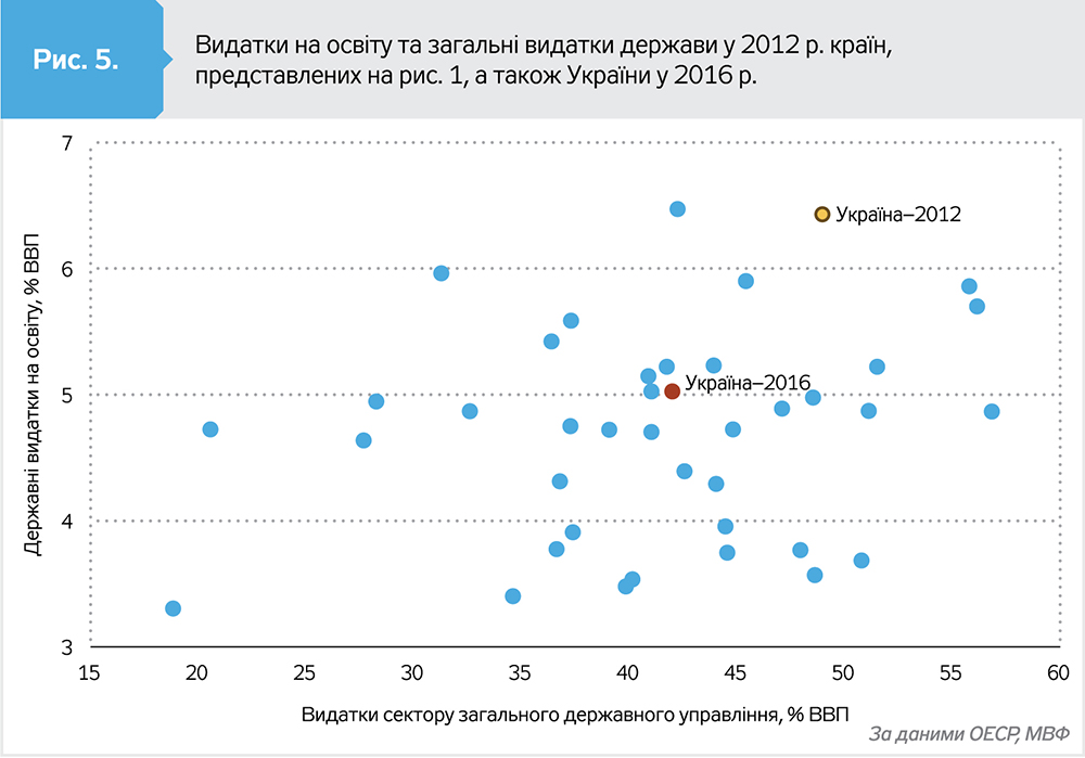 2. В умовах слабких інститутів чи не єдиним способом підвищити конкурентоспроможність національної економіки є забезпечити сприятливий податковий клімат шляхом зниження податкового навантаження, що викликає необхідність консолідувати держфінанси за рахунок зменшення видатків держсектору в економіці нижче 40% ВВП. У 2012 р. жодна з представлених на рис. 1 країн, чиї загальні держвидатки не перевищували 40% ВВП, не мала таких держвидатків на освіту, які були б вище 4,5% ВВП.