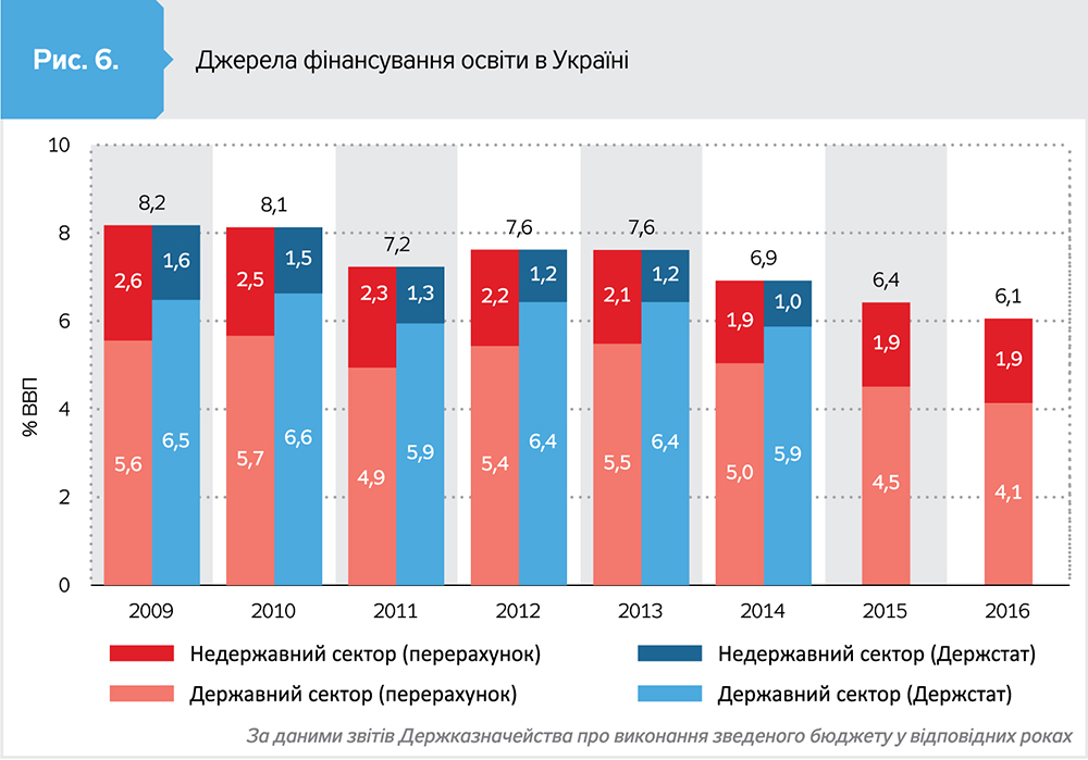 Тож якщо розглядати плату за навчання, цільові внески, плату за оренду приміщень та інші джерела власних надходжень навчальних закладів як недержавні джерела фінансування, то частка приватного фінансування буде вищою і коливатиметься в межах від 32% у 2009 р. до 27% у 2016 р.. У принципі це корелює з відповідними показниками у країнах з високим рівнем фінансування освіти та ліберальною моделлю побудови економіки.