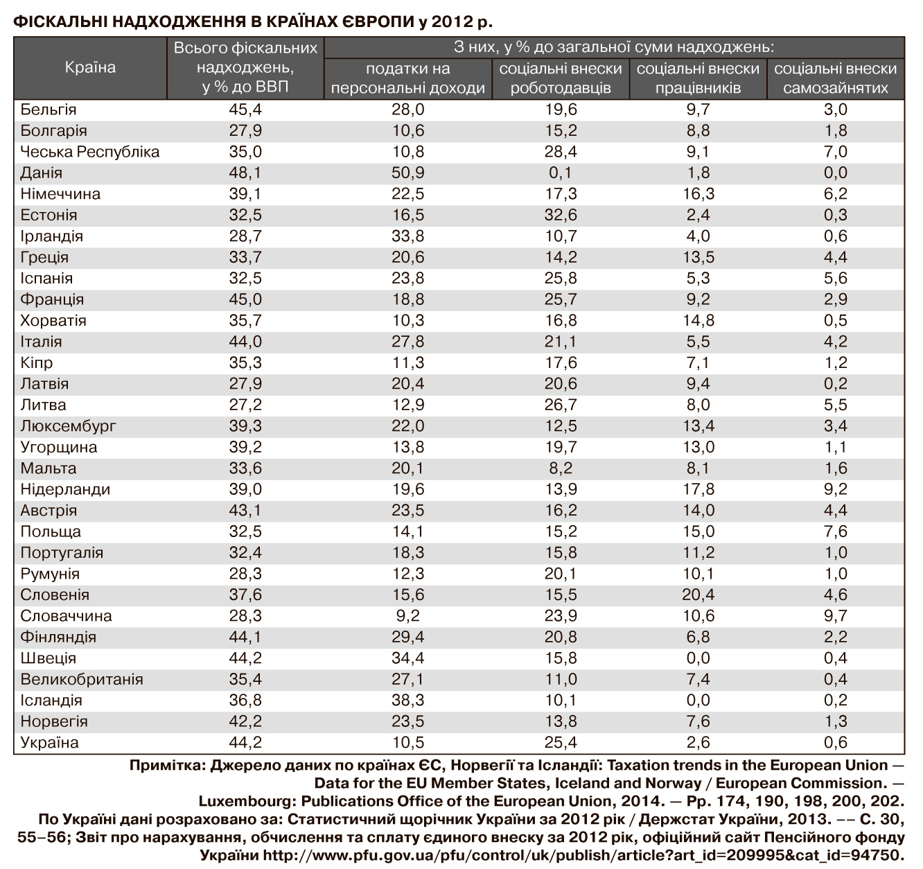 За відсотком ВВП, що перерозподіляється через фіскальну систему (податки + соціальні внески), Україна справді значно випереджає країни Центральної та Східної Європи: 44,2% ВВП у 2012 р. проти 28–37% ВВП у країнах - нових членах ЄС. Проте в більшості країн "старої" Європи ця частка становить 39–45%, а в Данії сягає 48,1% (див. табл.).