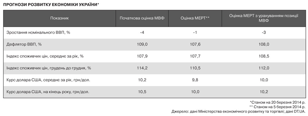 Новий уряд пообіцяв переглянути перспективи економічного розвитку. 5 березня Мінекономіки підготувало оновлений прогноз динаміки ВВП: він у 2014 р. скоротиться на 1%, підрахували у відомстві. Інфляція становитиме 10,5% грудень до грудня, кажуть дані порівняння позицій МВФ і МЕРТ, які є в розпорядженні DT.UA.