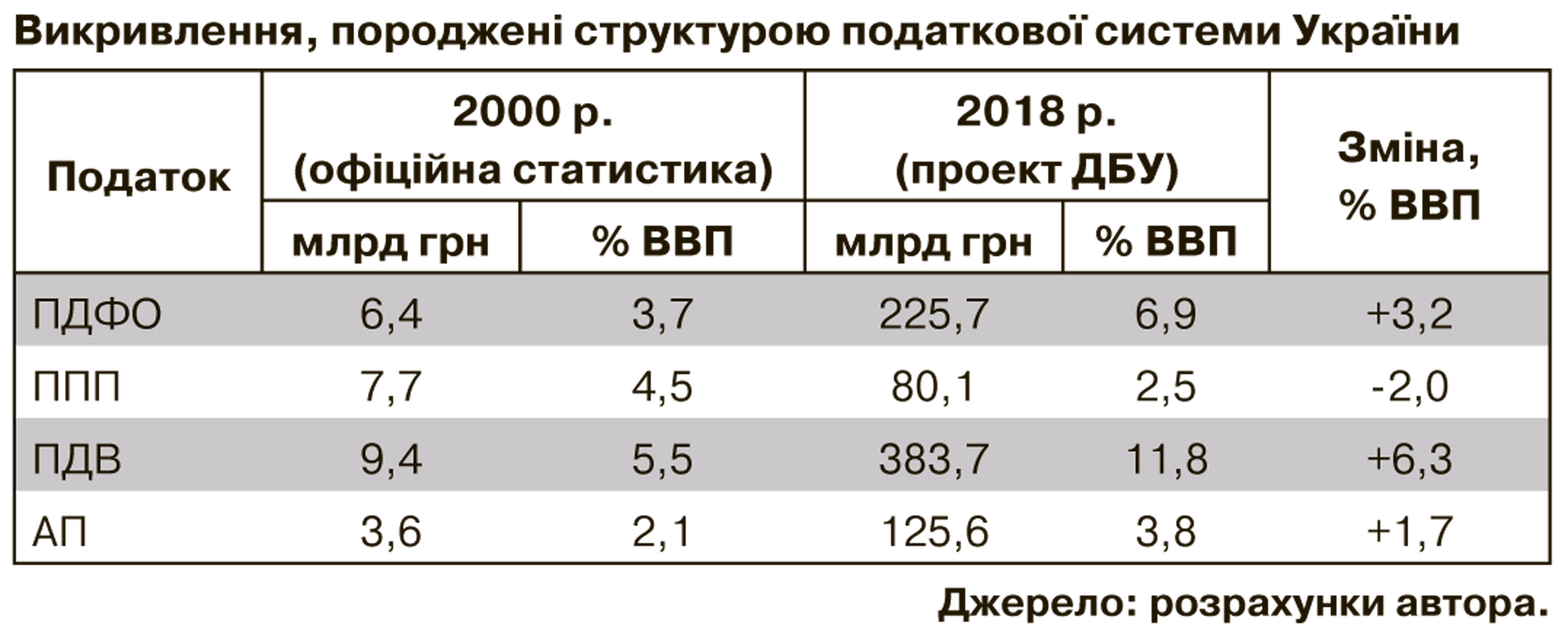 Інший приклад - так званий податковий зсув (tax shift), він у нас таки відбувся, але по-своєму, по-українськи. Нагадаємо, що за рекомендаціями фахівців з податків і податкової політики ЄС для того, щоб податкова система країни сприяла економічному зростанню, необхідно було змістити податковий тягар з мобільних чинників виробництва, тобто праці і капіталу, і формувати його за рахунок споживання, оподаткування майна та ширшого використання екологічних податків. Це логічно, про це написано томи досліджень, але що в результаті ми маємо в Україні, де також багато про це написано науковцями й експертами, зокрема і мною. За період з 2000-го по 2018 р. статистичну картинку подано в таблиці, доволі примітивній, але красномовній. Для розрахунків на наступний рік узято за основу макропоказники з проекту державного бюджету на 2018-й, оскільки вони навряд чи істотно зміняться.