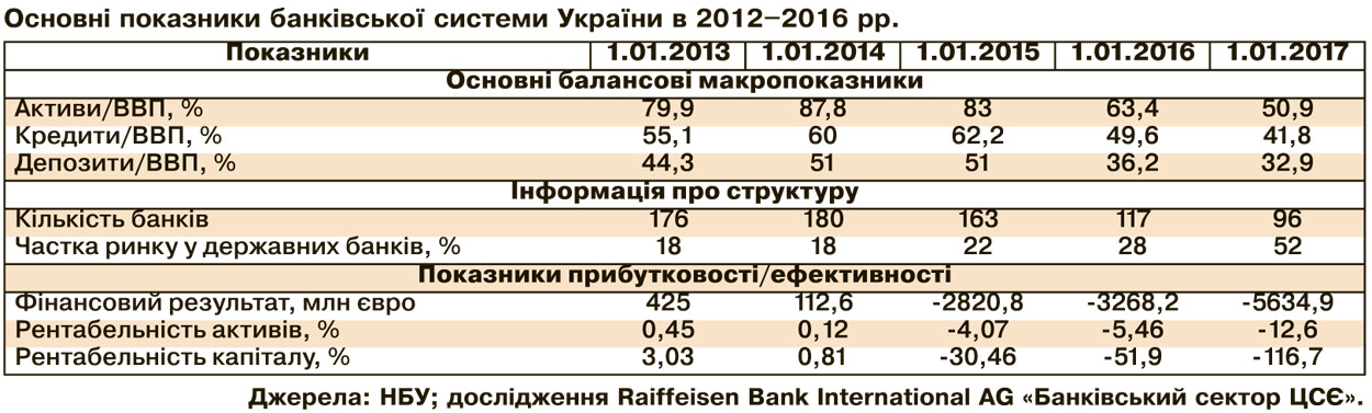 Отже, протягом останніх років чітко простежується тенденція зниження величини активів, кредитів, депозитів українських банків відносно ВВП. І це - найбільш наочна ілюстрація нестачі кредитів, необхідних для розвитку економіки, відпливу коштів населення й бізнесу з банківської системи, та й загального зниження ролі банків в економіці України. Збитки банківських установ узагалі досягли історичних максимумів. Так, у звіті Raiffeisen Bank International (RBI) AG (материнська структура АТ "Райффайзен Банк Аваль") "Банківський сектор Центральної і Східної Європи (ЦСЄ)" (2016) зазначається, що рівень проблемних кредитів і супутніх їм збитків банківської системи України суттєво перевищує аналогічні показники для всього східноєвропейського регіону. При цьому така збитковість має стрімко зростаючий тренд. Явно тривале "очищення" банківського ринку та зростання монопольного становища держави на ринку роблять банківський сектор, при декларуванні загальноєвропейського вектора для країни в цілому, більш подібним до банківської системи Росії, яка має протилежну філософію політико-економічної організації життя суспільства.