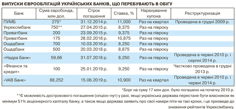До кінця нинішнього року погасити євробонди повинен лише один український банк - ПУМБ. В останній день грудня він має виплатити близько 258 млн дол. основного боргу своїм кредиторам. Ця фінустанова також має досвід реструктуризації боргу наприкінці 2009-го.
