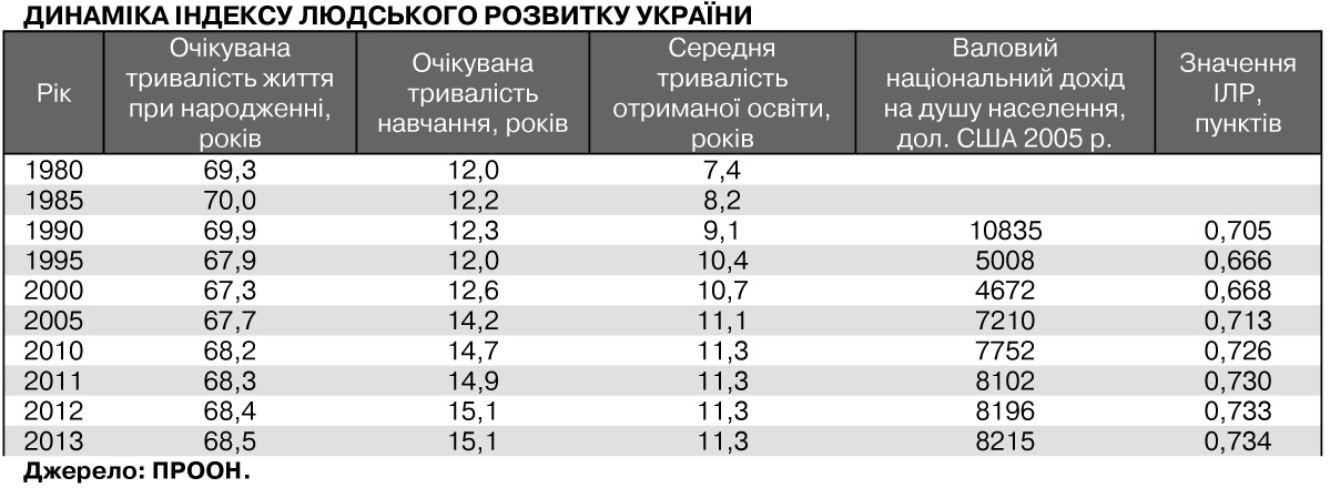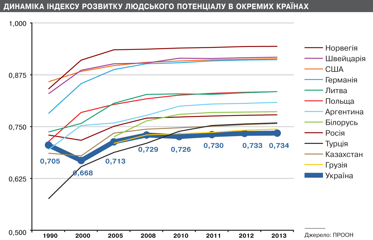 За підсумками 2013 р., Індекс людського розвитку (ІЛР) України, який розраховується щороку ООН, становить 0,734. Це 83-тє місце у світі - на п'ять позицій гірше порівняно з дослідженням-2012. Індекс нашої країни не зростає з середини 2000-х. Що ж заважає нам розвиватися?