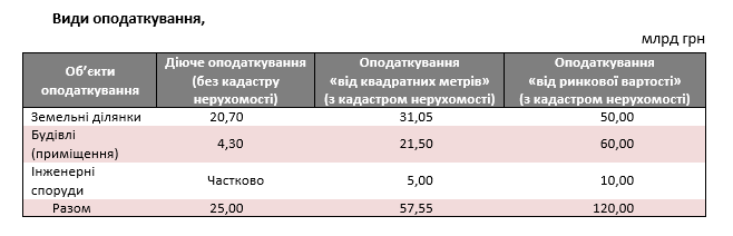 Отже, навіть при чинному законодавстві за наявності Держкадастру нерухомості ми можемо зібрати на 32,55 млрд грн більше, а при оподаткуванні оціночної вартості цілком реально збирати до 120 млрд замість 25 млрд грн, тобто в 4,8 разу більше.