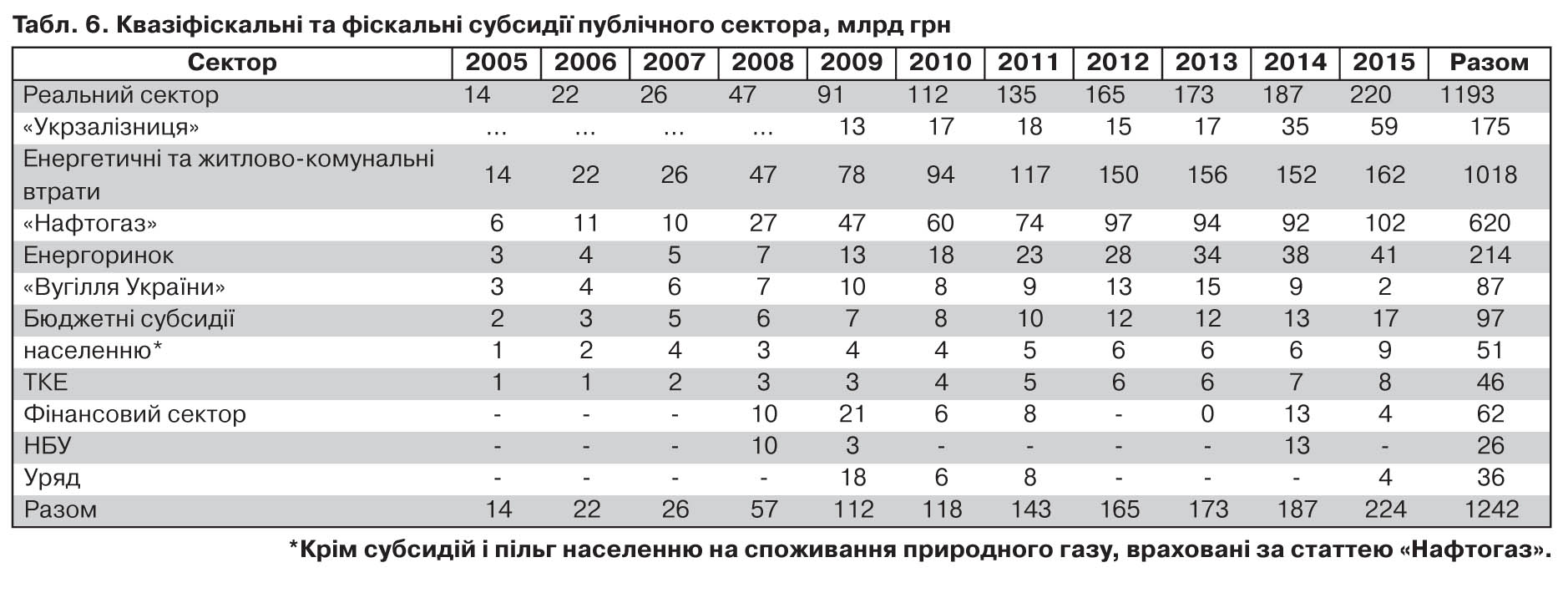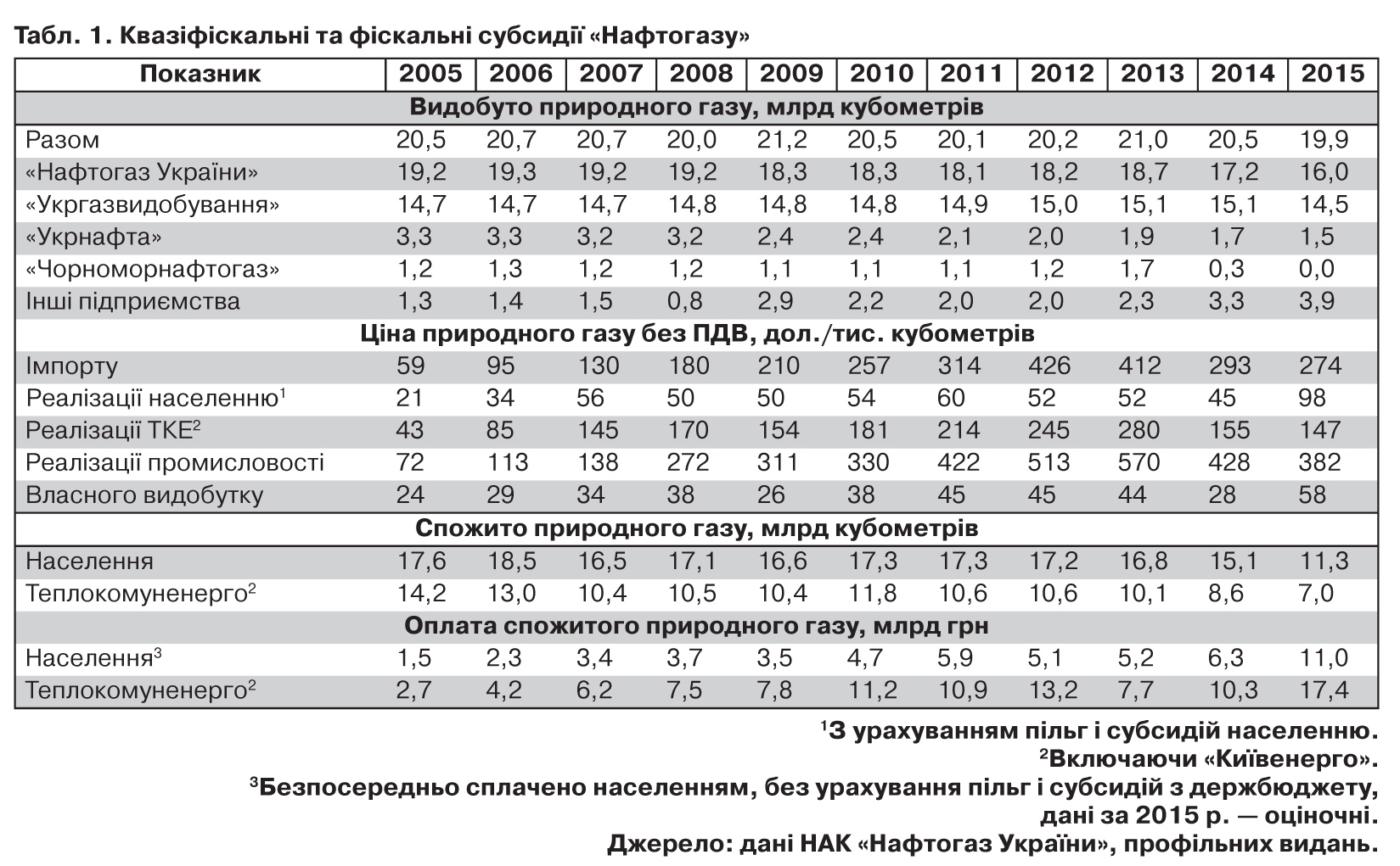 Навіть якби всі газодобувні підприємства, що входять у групу компаній "Нафтогазу", реалізовували природний газ за адміністративними цінами, це не перекривало би збитків, пов'язаних із здійсненням квазіфіскальних операцій. Обсяг власного видобутку такими підприємствами, як "Укргазвидобування", "Чорноморнафтогаз" та "Укрнафта", за 2009–2014 рр. становив у середньому 18–19 млрд кубометрів щороку, тоді як населення та підприємства теплокомуненерго використовували 27–28 млрд кубометрів. Крім того, через наявність політичної корупції "Укрнафта" практично не продавала природного газу за адміністративно встановленими цінами. "Укргазвидобування" та "Чорноморнафтогаз" також не реалізовували весь природний газ для потреб населення. Частина природного газу видобувалася в результаті спільної діяльності із приватними підприємствами, а тому газ реалізовувався для комерційних цілей, ще частина спрямовувалася на задоволення власних технологічних потреб компаній. Тому упродовж 2005–2013 рр. на потреби населення реалізовувалося щороку в середньому 15–16 млрд кубометрів природного газу власного видобутку, а в 2014–2015 рр. - близько 14–13,8 млрд (табл. 1). Тому для покриття збитків було задіяно інші джерела компенсації витрат.