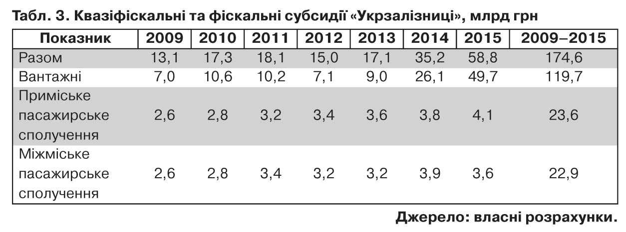 Відповідна цінова політика "Укрзалізниці", що передбачає дискримінацію вантажовідправників залежно від виду вантажу, призводить до значних квазіфіскальних витрат. Якщо згідно з методом (2) за ринкову ціну вантажних перевезень взяти вартість транзитних перевезень, то вартість відповідних втрат "Укрзалізниці" за 2009–2015 рр. становить майже 119,7 млрд грн, з них 49,7 млрд - тільки у 2015-му.