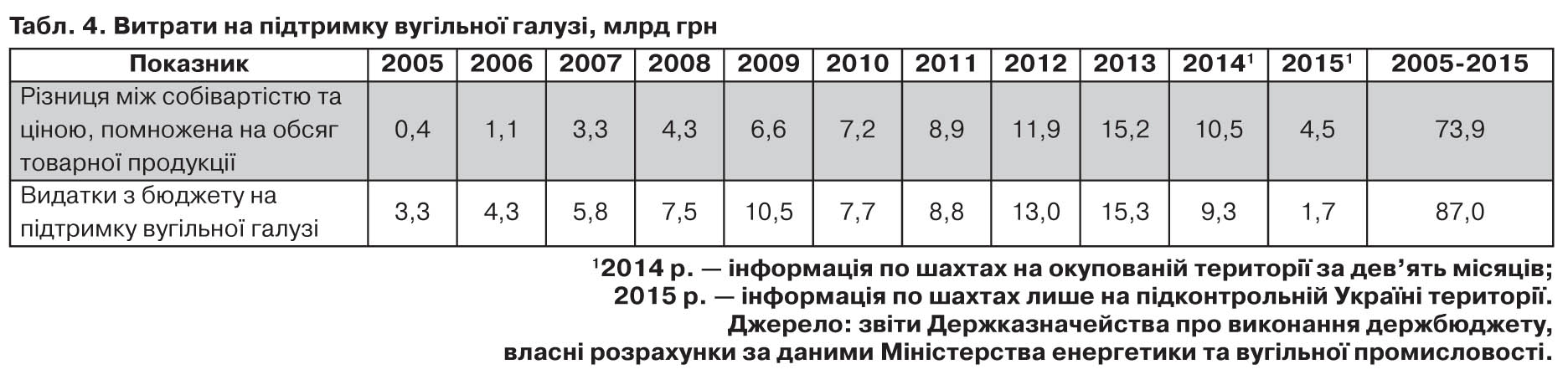 У табл. 4 відображено обсяг витрат, визначених за методом (2), а також видатки з бюджету на підтримку вугільної галузі. Перший показник недооцінює обсяг втрат, оскільки під собівартістю тут мається на увазі операційна собівартість, яка не враховує інших витрат, зокрема витрат на переоснащення підприємств, підвищення техніки безпеки, реструктуризацію та закриття шахт, покриття витрат за регресними позовами шахтарів та інших витрат, зниження ставок відрахувань до соціальних фондів. Другий показник - видатки з бюджету на підтримку вугільної галузі - краще характеризує втрати, але він включає витрати на погашення заборгованості за минулі періоди.