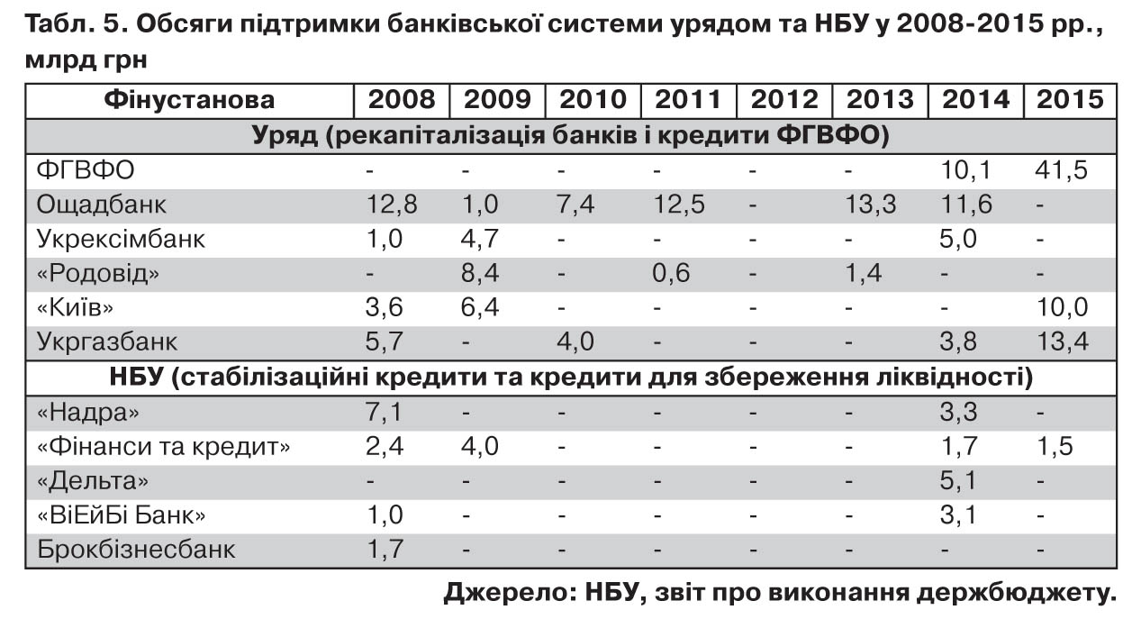 На рекапіталізацію збанкрутілих банків, зокрема Укргазбанку, "Родовід банку" та банку "Київ", було витрачено загалом 36 млрд грн протягом 2008–2015 рр. На кінець третього кварталу 2015-го обсяг нерозподілених збитків Ощадбанку становив 14,3 млрд грн, або 54% від обсягу рекапіталізації у 2008–2015 рр.; Укрексімбанку - 17,6 млрд (94% від обсягу рекапіталізації), Укргазбанку - 9,2 млрд грн (70%).