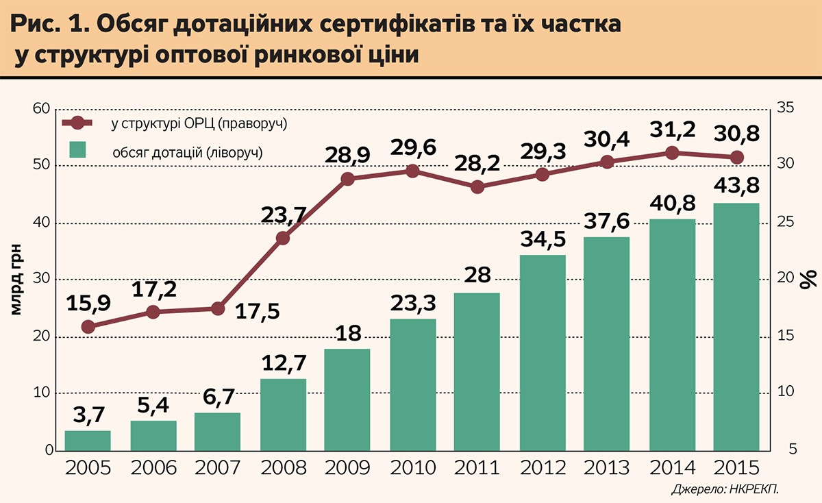 Сума дотацій, що надаються енергопостачальним компаніям для покриття збитків від постачання електроенергії пільговим категоріям споживачів, включається до складу оптових ринкових цін. Дотації протягом 2005–2015 рр. зросли майже в 12 разів - з 3,7 млрд грн до 43,8 млрд (без ПДВ) і в 2015 р. перевищили 31% у структурі ОРЦ.