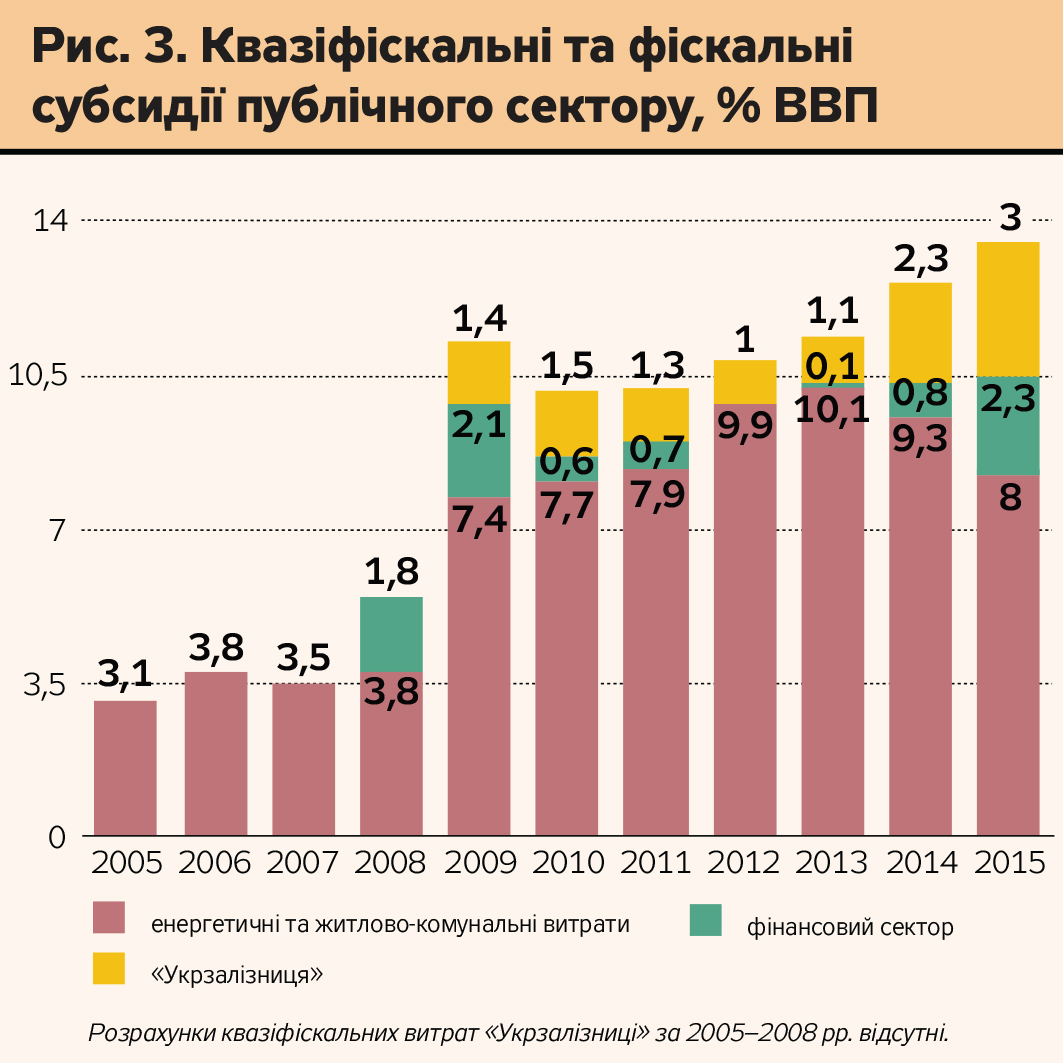 Як наведено на рис. 3, відношення квазіфіскальних і фіскальних субсидій до ВВП різко збільшилось у 2009 р - до 11,2% ВВП. Це в основному пов'язано із потенційними та реальними втратами "Нафтогазу" від реалізації природного газу пільговим категоріям споживачів і витратами на підтримку банківської системи. У 2010 р. вони знизилися до 10% ВВП, після чого знову почали зростати, досягнувши свого максимуму 2014-го - 14,1% ВВП.