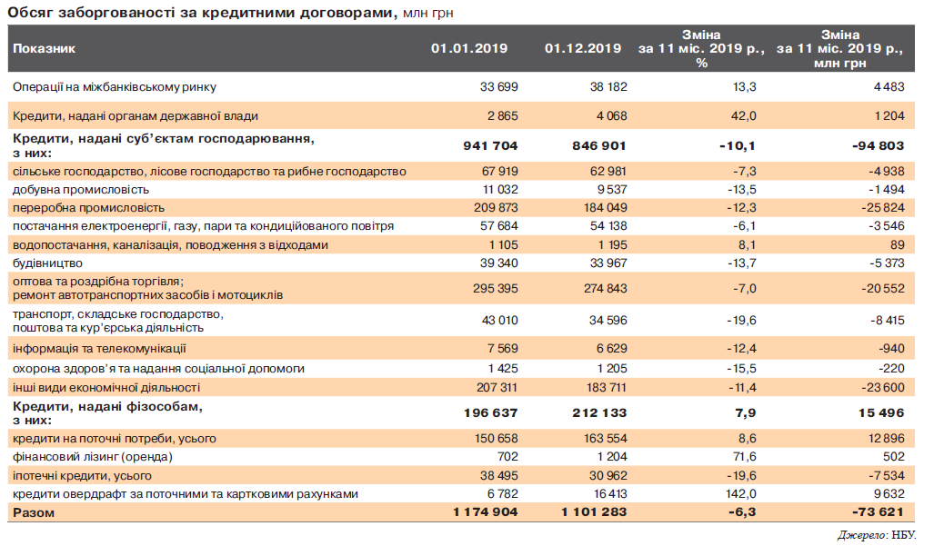 Залишки за кредитами, що надані бізнесу за 11 місяців минулого року, порівняно з початком 2019-го скорочуються практично за всіма видами економічної діяльності, супроводжуючись зниженням як заборгованості за чистими кредитами, так і резервів під знецінення кредитів (див. табл.).