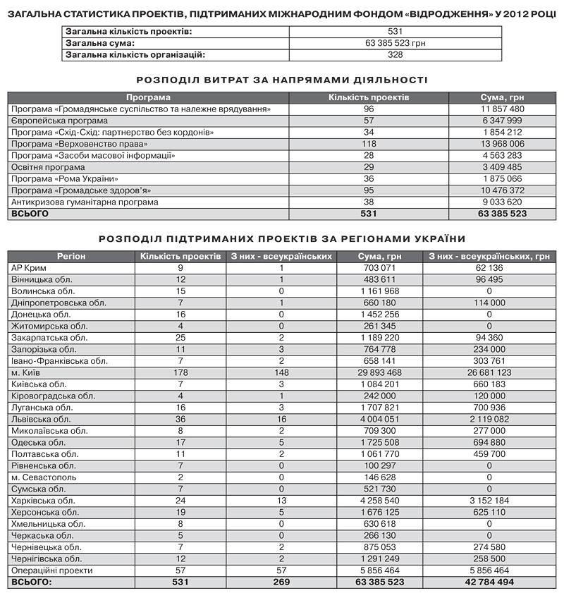 У 2012 році Міжнародний фонд "Відродження" сприяв широкому спектру громадських ініціатив, які мали важливу спільну рису – утвердження і захист демократичних перетворень в Україні та формування відкритого суспільства. Фонд надав фінансову підтримку організаціям громадянського суспільства в розмірі 63 мільйонів гривень – більше, ніж будь-яка інша донорська структура з тих, що працюють у цій сфері в Україні.