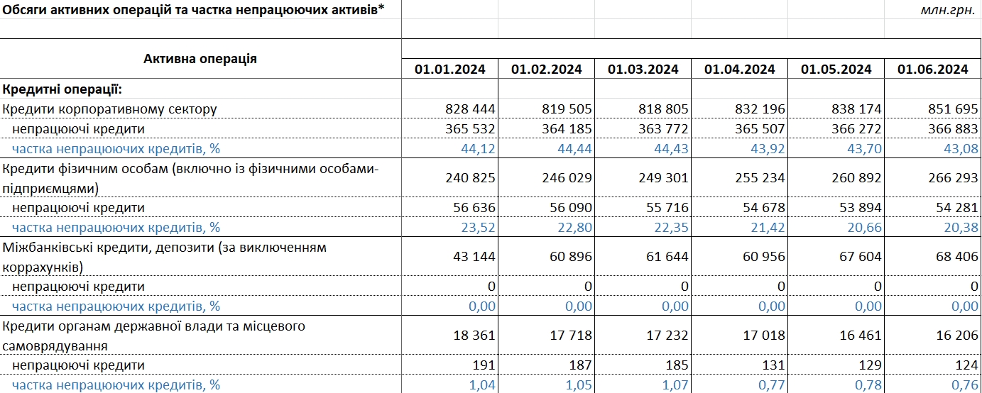 Динаміка кількості непрацюючих кредитів показує постійне зменшення таких фінансових активів. З початку року NPL-кредити для фізичних осіб скоротилися з 23,5% на початку року до 20,38% станом на червень. У корпоративному секторі на початок року обсяг непрацюючих кредитів складав 44,1%, а станом на початок червня – 43,08%.
