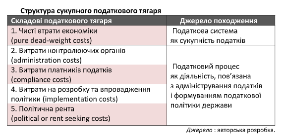 Загальновідомо, що податкове навантаження розглядається як відношення податкових зобов'язань до бази оподаткування. Цей показник може розраховуватися як на макро-, так і на мікрорівні. Всі знають, що податковий коефіцієнт в Україні становить близько 35% ВВП. Це і є перша складова податкового тягаря. Разом з цим існують ще витрати адміністрування податків контролюючими органами (administration costs), витрати на дотримання податкового законодавства платниками податків (compliance costs), витрати на розробку та імплементацію податкового законодавства (implementation costs), політична рента (political or rent seeking costs). Наочно все це можна собі уявити у вигляді таблиці (див. нижче). Слід зазначити, що остання величина в країнах зі значними масштабами корупції, клептократичною елітою та слабкою державою може бути досить вагомою як в абсолютному, так і у відносному вираженні. І де її шукати, всі знають, як із цим боротися, також, проте часто не вистачає ані бажання, ані політичної волі.