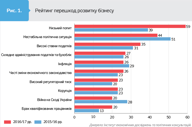Національний індекс ділового клімату, що вимірюється за шкалою від -1 (дуже погано) до +1 (дуже добре), в хвилі 2016/2017 підвищився до +0,06 порівняно зі значенням +0,01, яке було відповідно до щорічної оцінки 2015/2016 р. Індекс - це показник комплексний, він складається з чотирьох оцінок: ділове середовище загалом, ділова активність у коротко- і довгостроковій перспективі та регуляторні процедури. За рік, що минає, покращилися три з чотирьох складових. І хоча негативні оцінки саме ділового середовища переважать позитивні, все ж вони кращі, ніж минулого року, і це додає оптимізму й нам, дослідникам. Але найважливішим драйвером є оптимізм бізнесу.