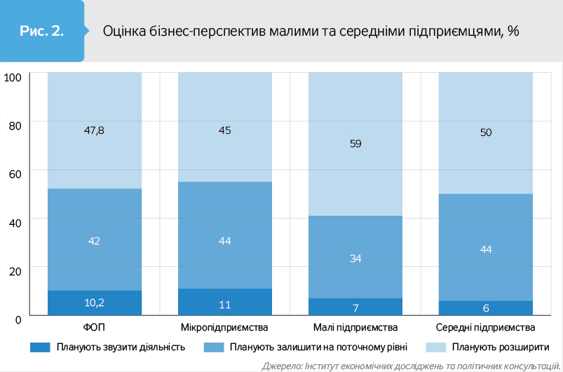 Незважаючи на всі проблеми, МСП оптимістичні в своїх виробничих планах - 47,8% мають намір розширити діяльність протягом наступних двох років і лише 10,2% очікують на скорочення обсягів у такій перспективі. Зазначу принагідно, що це найкращі з усіх очікувань, які вимірювалися в цьому дослідженні, й тенденція має ознаки сталості. Так, у першій хвилі "оптимісти" також суттєво переважали "песимістів": 53% МСП планували розширити діяльність у дворічній перспективі, а 8% - скоротити. Найбільш оптимістичні малі та середні підприємства. Тут прискіпливий читач може зауважити, що баланс "довгострокового" оптимізму дещо погіршився в другій хвилі дослідження порівняно з першою: було +45, а стало +38. Це дійсно так, довгостроковий оптимізм дещо зменшився, й цьому є пояснення, про що нижче. Однак констатуємо факт: бізнес-клімат, "за відчуттями" МСП, поступово, але поліпшується.