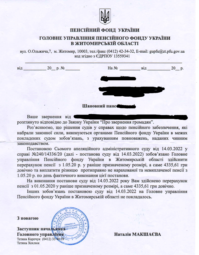 «Постанова Сьомого апеляційного адміністративного суду від ... зобов'язала Головне управління Пенсійного фонду України в Житомирській області провести Вам перерахунок пенсії з 1.05.20 р. у раніше призначеному розмірі, а саме 4335,61 грн довічно... Оскільки пенсія Вам перерахована на виконання рішення суду ... у твердому розмірі 4335,61 грн, тому перерахунок пенсії з урахуванням коефіцієнтів... не проводився».