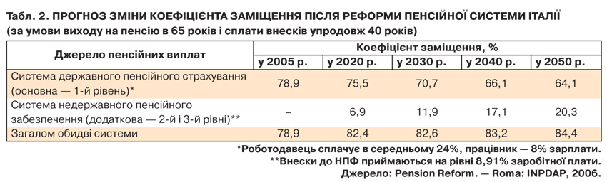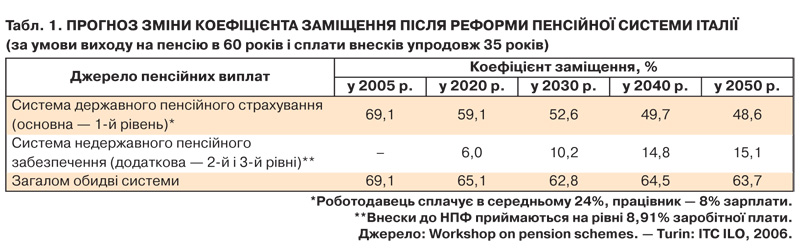 Реформуванню пенсійних систем в європейських країнах передують багаторічні дискусії, що супроводжуються доступними для населення розрахунками і рекомендаціями експертів, які базуються на результатах досліджень державних і неурядових установ. Критерій ефективності (кількісний вираз мети) реформування пенсійних систем вимірюється коефіцієнтом заміщення (КЗ) заробітку пенсійними виплатами з усіх джерел або "рівнів". За величиною КЗлюдина може визначити, наскільки зміниться її дохід, а відтак, і добробут, коли вона вийде на пенсію. Наприклад, якщо заробіток до виходу на пенсію становив 2000 євро, а пенсія - 1200 євро, то КЗ дорівнює 60%. У цивілізованих країнах намагаються зберегти КЗна рівні 65–75%, тоді як його зменшення до 40% вважається загрозою економічній безпеці пенсіонера і держави. Так, в Італії реформа, що розпочалась у 1992 р. та триває й понині, супроводжується наведеними нижче розрахунками.