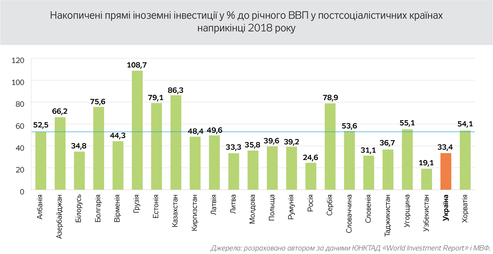 В Україні обсяг накопичених ПІІ становить лише 33,4% річного ВВП, тоді як у постсоціалістичних країнах середній рівень досягає 51,3% (див. рис.).
