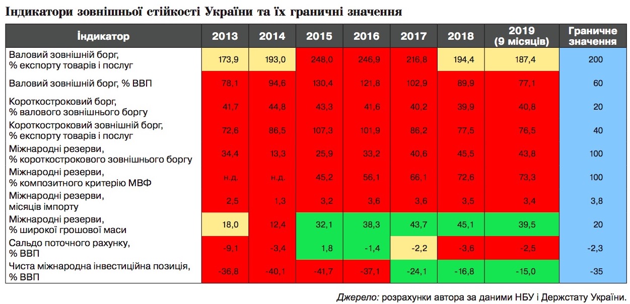 У відносному вимірі зовнішній борг усіх секторів економіки станом на 30 вересня 2019 року становив 77,1% ВВП, що суттєво перевищує прийняті у світі граничні значення. Сумарні платежі уряду та НБУ в рахунок погашення і обслуговування зовнішнього державного боргу 2020 року оцінюються на рівні близько 8,9 мільярда доларів, і це без урахування валютних ОВДП.