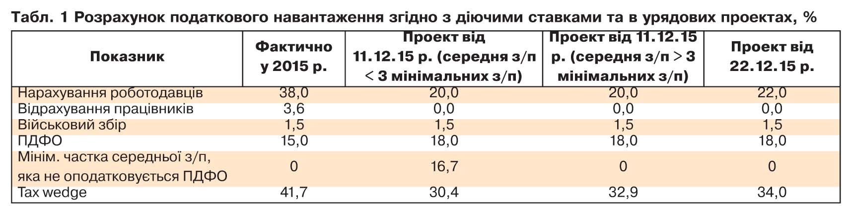 11 грудня 2015 р. це співвідношення знизилось би до 30,4% (якщо середня зарплата буде меншою трьох мінімальних зарплат) і 32,9% (якщо середня зарплата перевищуватиме цей рівень). Слід зазначити, що трикратний розмір мінімальної зарплати практично завжди перевищував середню заробітну плату. В кризові періоди (у 2009-му та 2015 р.), а також у грудні кожного року, коли розрив між зарплатами у бюджетному і приватному секторах збільшувався, середня зарплата перевищувала цю величину. Оскільки в ухваленому законі граничний дохід знижено до 1,4 мінімальної зарплати та збільшено ставку ЄСВ для роботодавців (з 20 до 22%), то рівень податкового навантаження у структурі виплат на оплату праці становитиме 34% (рис. 3, табл. 1).