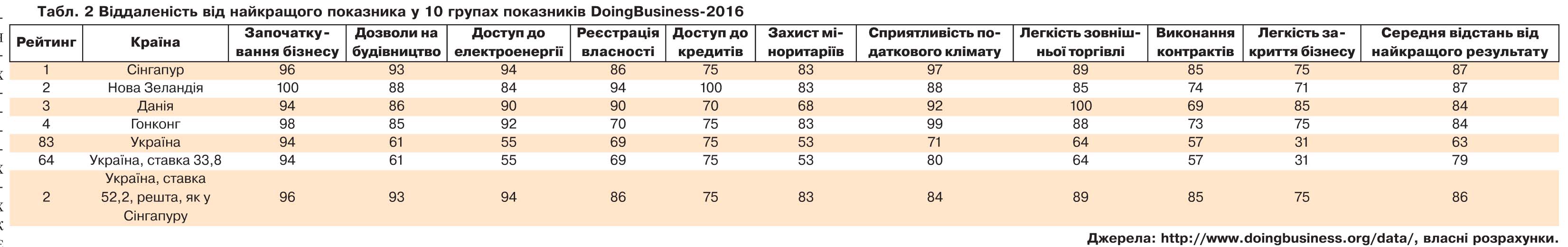 Для того, щоб перевірити, наскільки надмірне податкове навантаження впливає на інвестиційну привабливість країн і діловий клімат, звернімося до вже відомого в Україні показника Світового банку Doing Business. Він визначається виходячи з десяти рівнозначних груп показників, наведених у табл. 2 (див. на сайті DT.UA). У 2016 р. серед 189 країн та окремих міст Україна посіла 83-тє місце, набравши 63 бали із 100. Методика рейтингування передбачає визначення віддаленості конкурентоспроможності певної країни від найкращого показника в розрізі 36 індикаторів. Ці індикатори об'єднані в 10 груп і рівномірно впливають на показник кожної з них. Як видно з табл. 2, до сегментів, які перевищують середній результат (63 бали), належать: а) започаткування бізнесу - 94 бали із 100; б) хоч як дивно, можливості кредитування - 75 балів; в) навіть злощасний податковий клімат - 71 бал; г) реєстрація власності - 69 балів.
