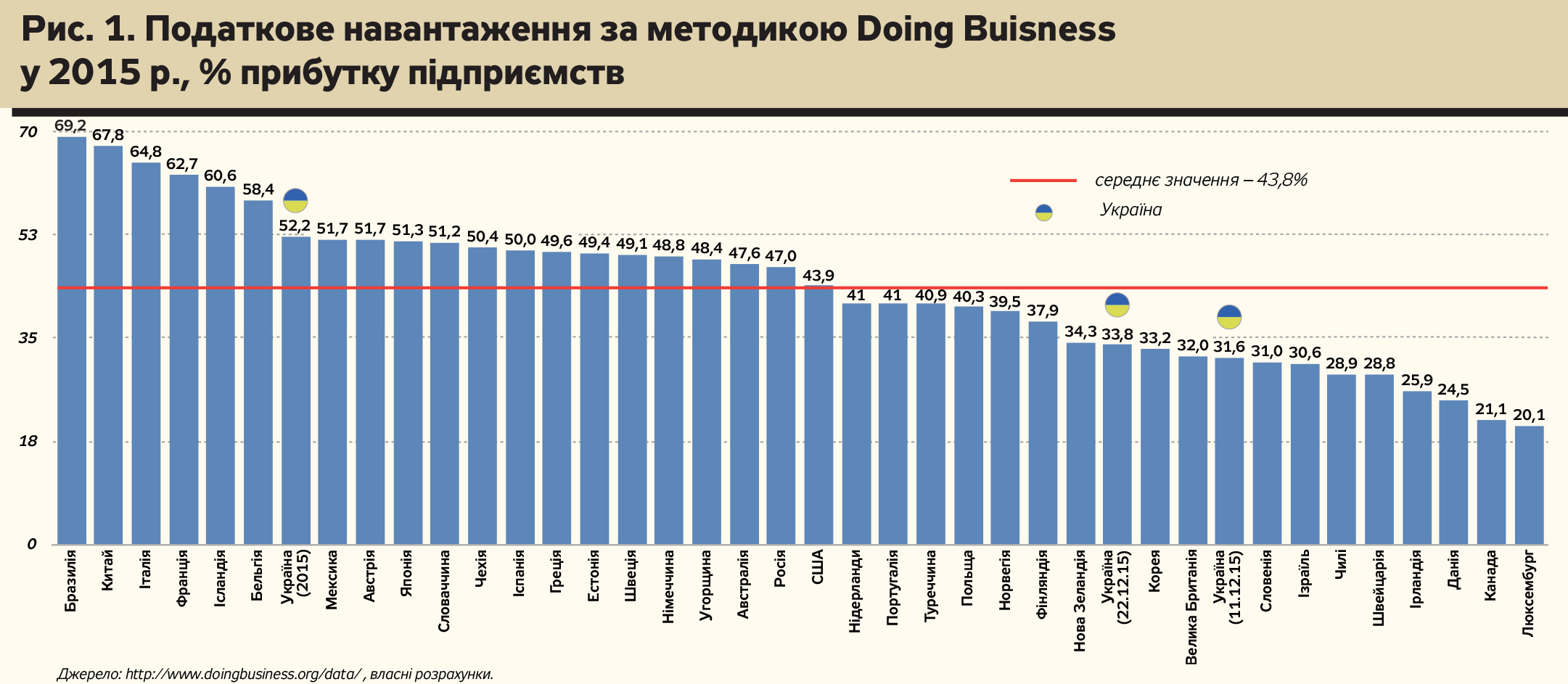 Надмірне оподаткування і конкурентоспроможність. Згідно з методикою Doing Business (DB), у 2015 р. середнє податкове навантаження в Україні становило 52,2% від прибутку підприємств - 30-те місце серед 189 країн. Але в методиці DB враховуються лише два види податків і зборів - податок на прибуток підприємств і ЄСВ, що його сплачують роботодавці. Оскільки ставка ЄСВ в Україні дуже висока, то і рівень податкового навантаження згідно з цією методикою відповідний (див. рис.1 на сайті DT.UA).