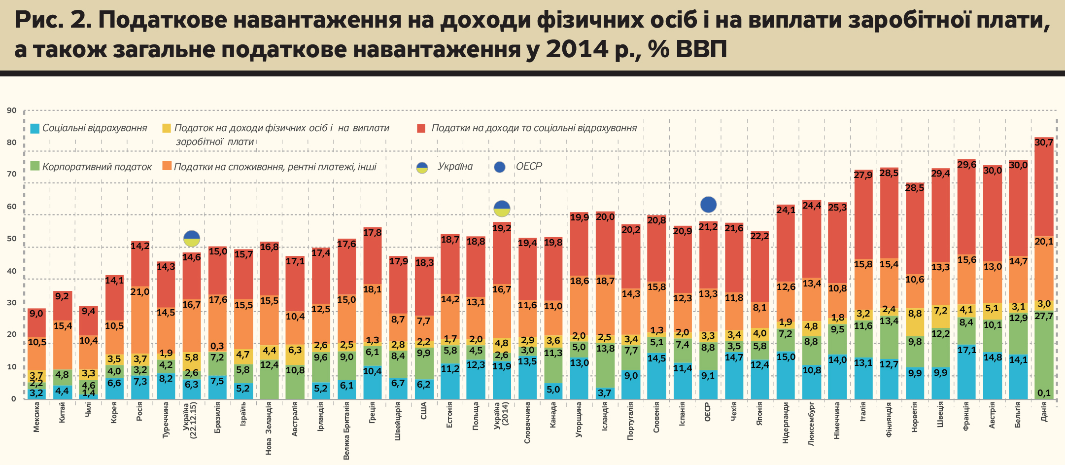 Тобто загалом податкове навантаження в Україні справді є одним із найвищих у світі, але не настільки великим, як це виглядає, виходячи із показника податкового навантаження Doing Business або некоректних порівнянь різних показників податкового навантаження на оплату праці в Україні та країнах ОЕСР, оскільки у нас базою є фонд оплати праці, а у них - загальні витрати на оплату праці, включаючи обов'язкові податки і збори.