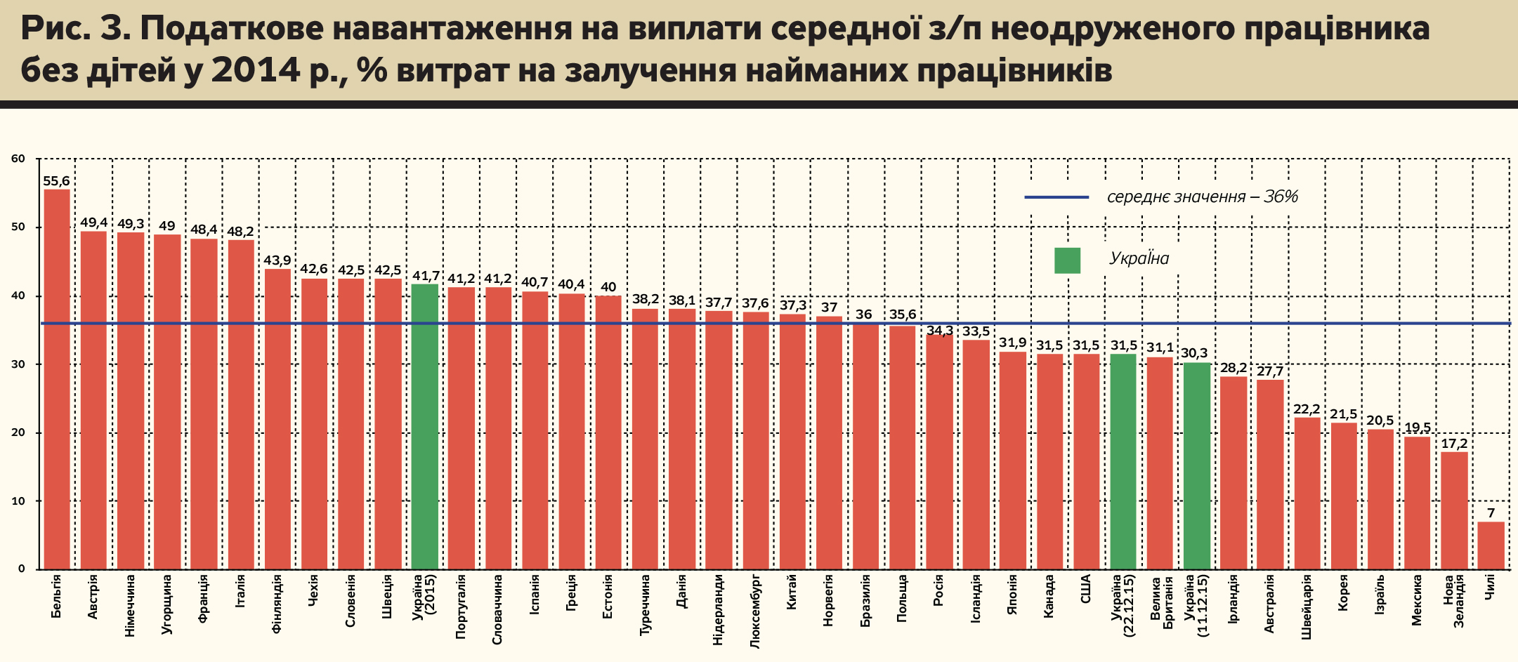 Розглянемо податкове навантаження на витрати з оплати праці. Для його оцінки в Україні традиційно використовується співвідношення між обов'язковими виплатами і зборами відносно фонду заробітної плати. Однак проблема в тому, що порівняння здійснюється із показником tax wedge в інших країнах, на враховуючи того, що останній визначає частку обов'язкових платежів у структурі всіх виплат на оплату середньої зарплати неодруженого працівника без дітей, включаючи обов'язкові платежі до бюджету (див. DT.UA від 26 грудня 2014 р., "Зниження ставки єдиного соціального внеску: за і проти").