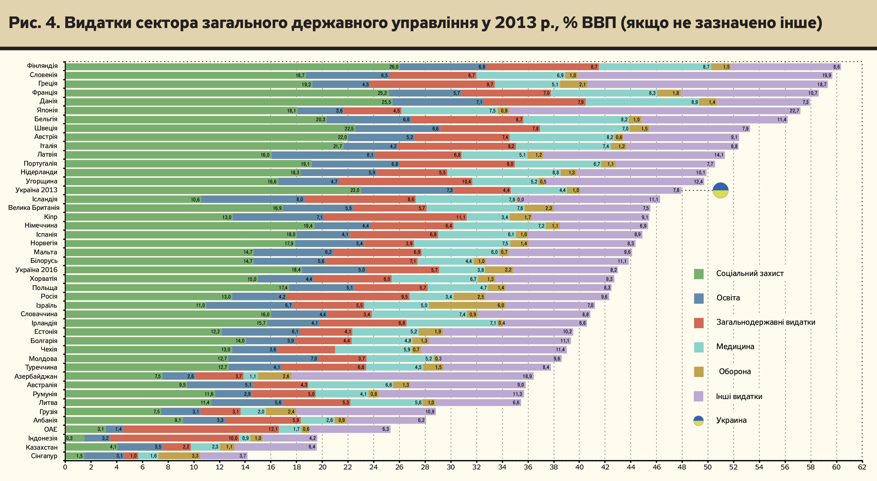 Ще одна стаття, яка часто стає предметом спекуляцій, -загальнодержавні видатки на управління, на які у 2016 р. передбачено 5,7 % ВВП. Однак із них на обслуговування боргу припадає 4,4% ВВП, решта спрямовується на утримання апарату держслужбовців і на дослідження в сфері держуправління - 1,3% ВВП. За останнім показником, серед 44 країн, представлених на рис. 4, Україна друга після Сінгапуру (1% ВВП). Про це слід пам'ятати, критикуючи за непрофесіоналізм, корупцію та інші гріхи українських чиновників, як, власне, усіх працівників бюджетного сектора.