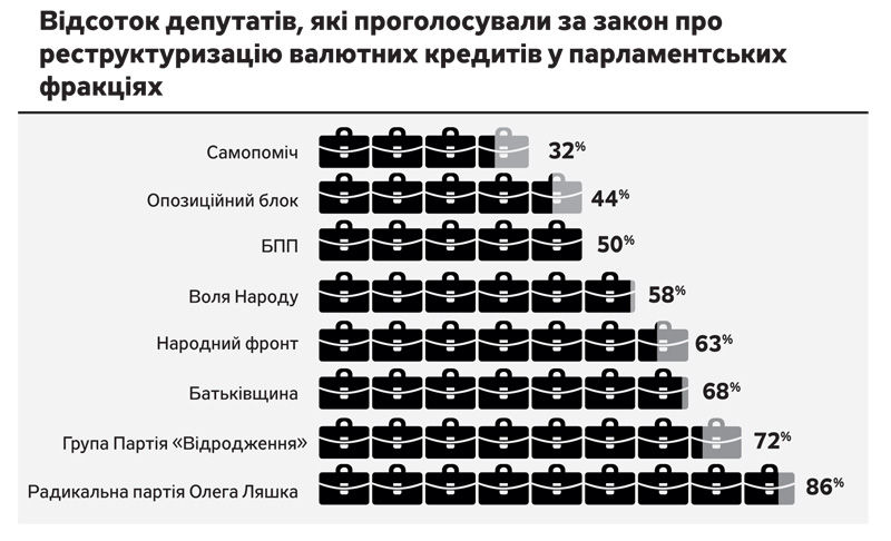 Валютні кредити населенню, за даними НБУ, на початок травня становили приблизно 5,9 млрд у доларовому еквіваленті. Із цієї суми потрібно виключити кредити, видані фізособам на ведення бізнесу, які не підпадають під чинність закону. У результаті списання за валютними споживчими кредитами можуть становити близько 60% усієї заборгованості. За даними НБУ, якщо всі кредити, надані фізичним особам-резидентам в іноземній валюті, конвертувати в гривню за курсом 5,05 грн/долар США, то банківська система зазнає збитків у сумі близько 100 млрд грн - це понад 4,7 млрд дол. На 1 червня ц.р. капітал усієї банківської системи становив 139 млрд грн, або 6,6 млрд дол. Очевидно, що звалити на себе вантаж популізму та виконати норми прийнятого парламентом закону банки просто не в змозі.