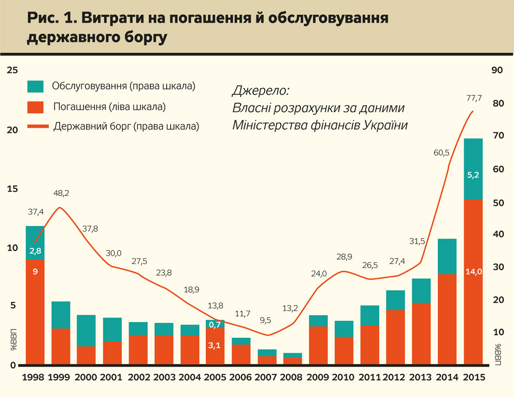 Досягнення домовленості з приватними кредиторами щодо реструктуризації зовнішніх зобов'язань українського суверена, про яке хоча й не повідомили ще офіційно, однак уже широко висвітлюють у ЗМІ, не повинно стати приводом для самозаспокоєння. Адже глибинні причини, через які протягом останніх років боргове навантаження на державний бюджет України зростало такими високими темпами (які й призвели до сповзання до фактичної неспроможності наших держфінансів виконувати свої зобов'язання повною мірою), залишилися неусунутими. Очікується, що у 2015 р. рівень боргу сектора загального державного управління (СЗДУ) становитиме 84% ВВП (без урахування Криму та окупованих територій Донбасу), державного і гарантованого державою боргу - 91% ВВП, у тому числі державного - 78% ВВП. Виплати з погашення та обслуговування держборгу зростуть до19% ВВП. Якщо для розвинених країн такі показники боргового навантаження є допустимими, то для України вони критичні.