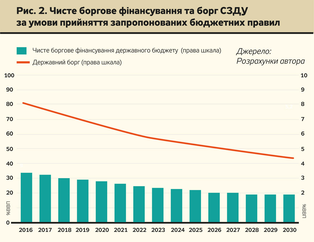 Можна запропонувати й альтернативний, більш жорсткий варіант, який передбачає, що у разі перевищення державним боргом 33% ВВП обсяг чистого боргового фінансування державного бюджету не може перевищувати 50% видатків на обслуговування державного боргу. При дотриманні зазначеного бюджетного правила рівень боргу СЗДУ у