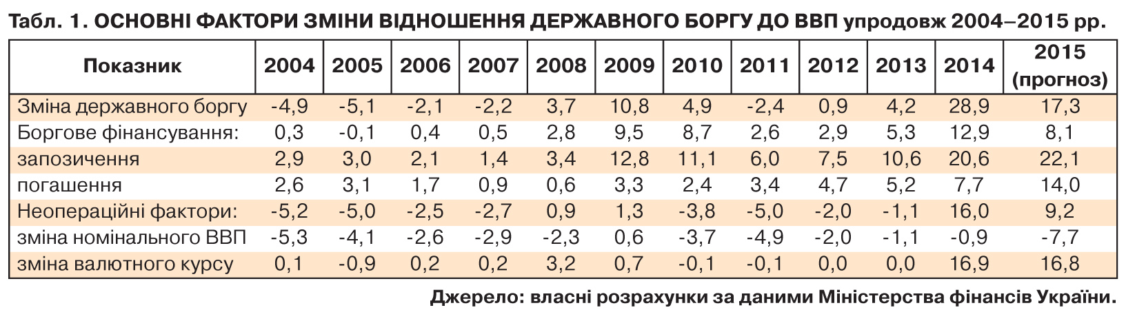 Основними причинами зростання рівня державного боргу в Україні протягом 2014–2015 рр. є значні обсяги боргового фінансування, внаслідок якого рівень держборгу збільшиться на 21% ВВП. Крім цього, внаслідок зміни валютного курсу рівень державного боргу підвищиться ще на 34% ВВП. Настільки значний вплив останнього фактора свідчить про недооцінку валютних ризиків і необхідність внесення змін до Бюджетного кодексу, які, за можливості, обмежували б частку держзапозичень в іноземній валюті.