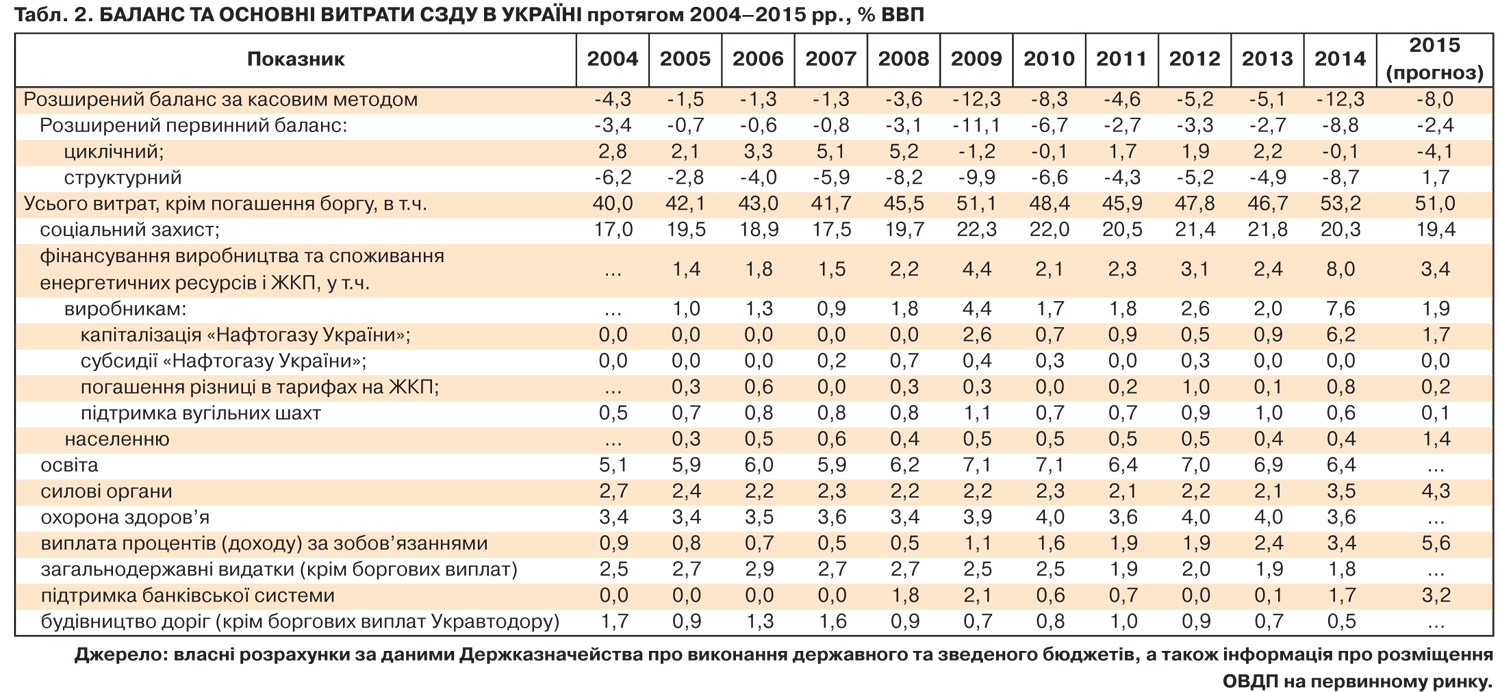 На період проведення реформ і стабілізації економічної та політичної ситуації провідні країни світу разом із міжнародними фінансовими організаціями запропонували Україні вигідні умови фінансування з чіткою вимогою консолідувати держфінанси та зменшити боргове навантаження. В умовах надвисоких (не пов'язаних із погашенням боргових зобов'язань) витрат СЗДУ, які у 2014 р. досягли 53,2% ВВП (також найвищий показник з часу здобуття Україною незалежності, див. табл. 2), в уряду не було іншої альтернативи, аніж запланувати різке обмеження практично всіх статей видатків, не пов'язаних із погашенням боргу, - до 51% ВВП. Такі заходи дали змогу запланувати зниження розширеного балансу СЗДУ з -12,3 до -8,0% ВВП. Про жорсткість фіскальної політики свідчить запланований первинний структурний баланс СЗДУ (який вважається традиційним показником зусиль уряду щодо збалансування державних фінансів) із профіцитом на рівні 1,7% ВВП, тоді як у 2014 р. структурне сальдо було від'ємним і становило -8,7% ВВП.