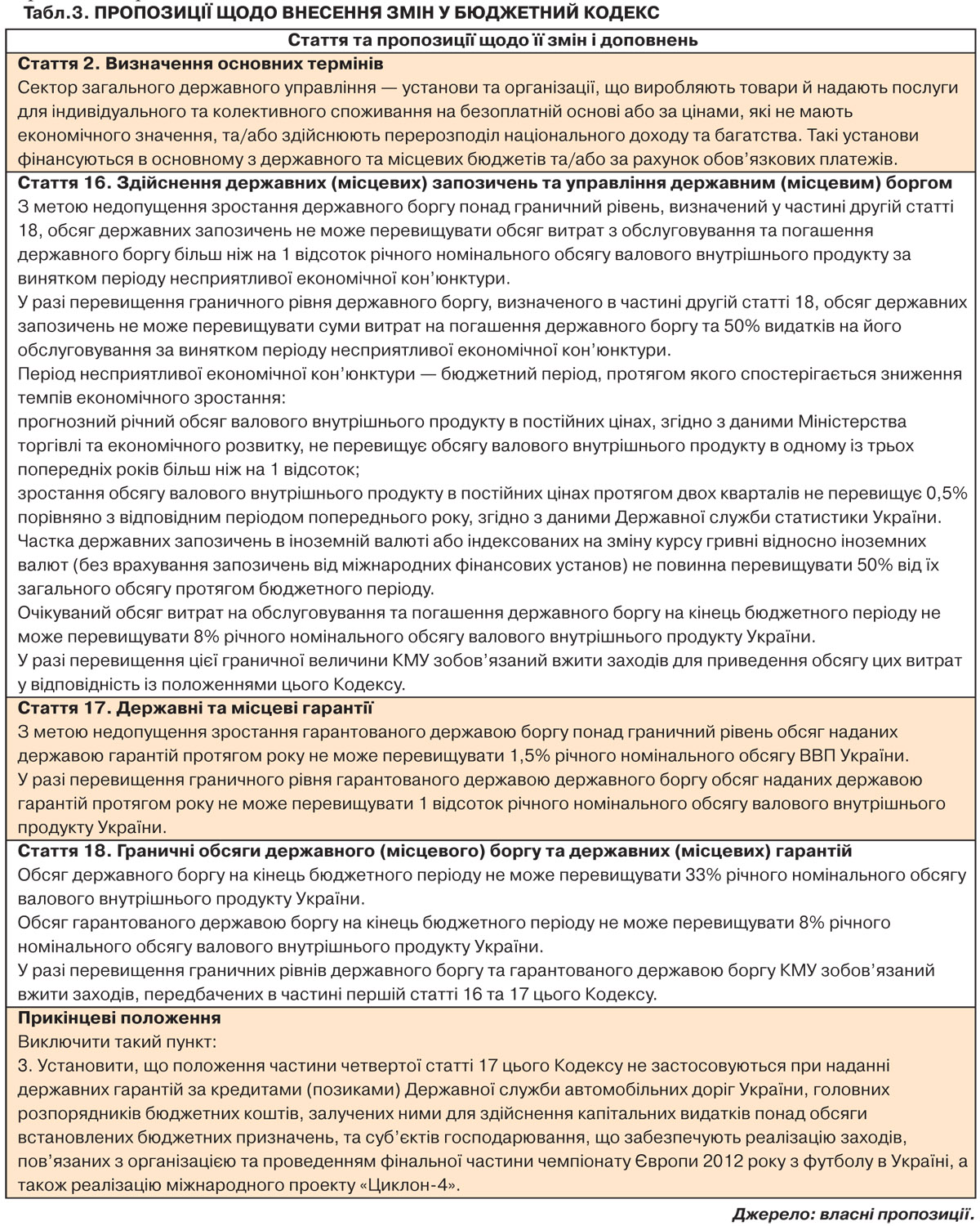 - посилити обмеження обсягу державного та гарантованого державою боргів, встановивши їх гранично допустимі рівні відповідно у 33 та 8% ВВП;