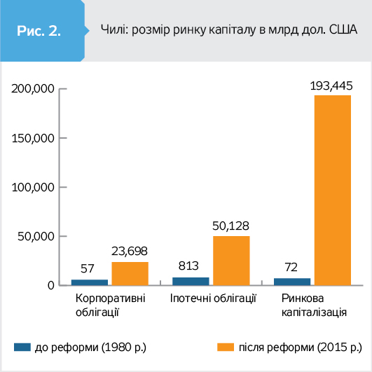 У Чилі адміністратори пенсійних фондів мають частку розміром у 34% від державного боргу, 58% від загальної фінансової заборгованості, 37% корпоративних облігацій, 6% від акцій.