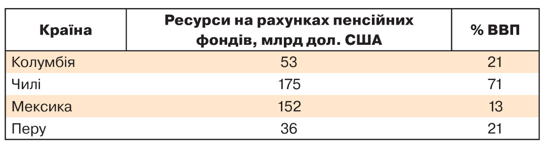 У випадку Чилі, країни з населенням у 18,5 млн чол., пенсійні фонди досягають 175 млрд дол. США, 1/3 з яких відноситься до нарахованих коштів самих працівників і 2/3 відповідає рентабельності, що була отримана шляхом інвестицій пенсійних фондів.