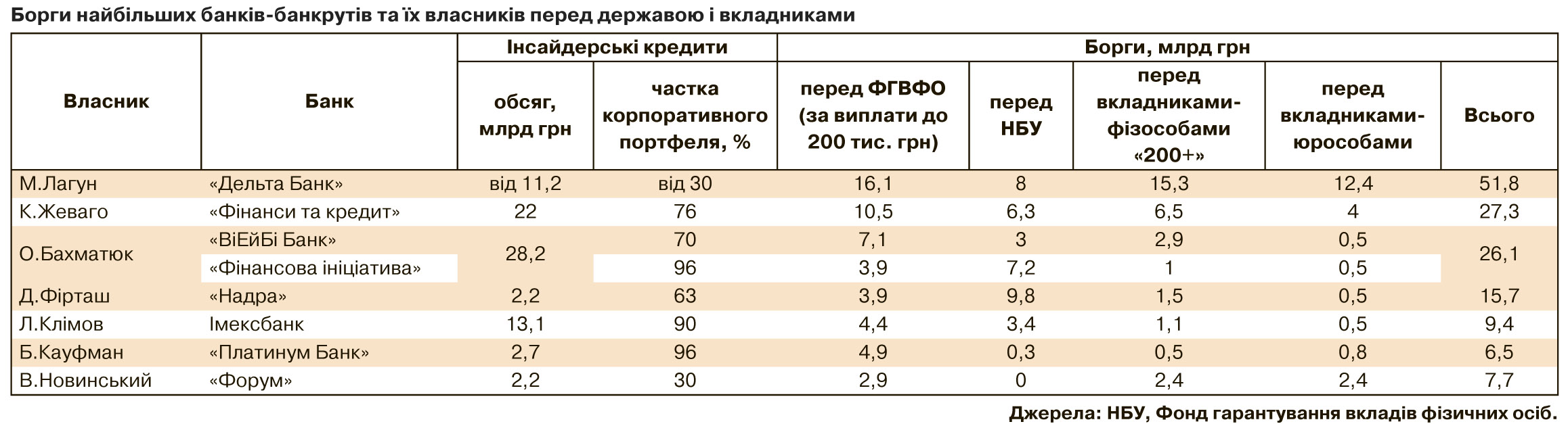 За даними НБУ і ФГВФО, сукупний обсяг інсайдерських кредитів у портфелі банків О.Бахматюка - 28,2 млрд грн (70% корпоративного портфеля "ВіЕйБі" і 96% - "Фінансової ініціативи"), у банку К.Жеваго - 22 млрд (76% портфеля), у банку Л.Климова - 13,1 млрд (90%), у банку Б.Кауфмана - 2,7 млрд (96 %), у банку В.Новинського - 2,2 млрд грн (30%).