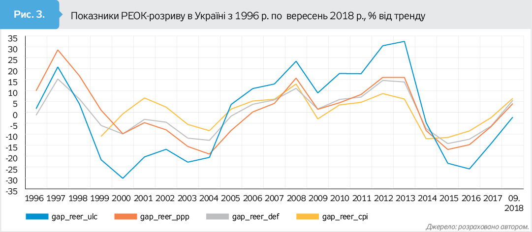 2018 р. вказують на незначну переоцінку національної валюти у вересні 2018-го за трьома методами, і лише результати одного методу вказують на незначну недооцінку гривні. Зокрема, згідно з РЕОК на основі ціни одиниці робочої сили (REERULC) валютний курс гривні після девальвації практично відповідав рівноважному рівню. Таке розходження між показниками РЕОК-розриву може пояснюватися тим, що потенціал зниження REERCPI за рахунок зниження митних і торгових бар'єрів вичерпався, чого не враховує тренд, визначений на основі минулих тенденцій. Відповідно, тренд перебуває нижче фактичних значень REERCPI, і виникає позитивний РЕОК-розрив. Зважаючи на це, а також на наявність тіснішої кореляції між торговим балансом і реальним обмінним курсом на основі ціни одиниці робочої сили порівняно із реальним обмінним курсом на основі ІСЦ, є підстави вважати дані розриву РЕОК на основі ціни одиниці робочої сили (REERULC) більш достовірними, ніж інші три показники.