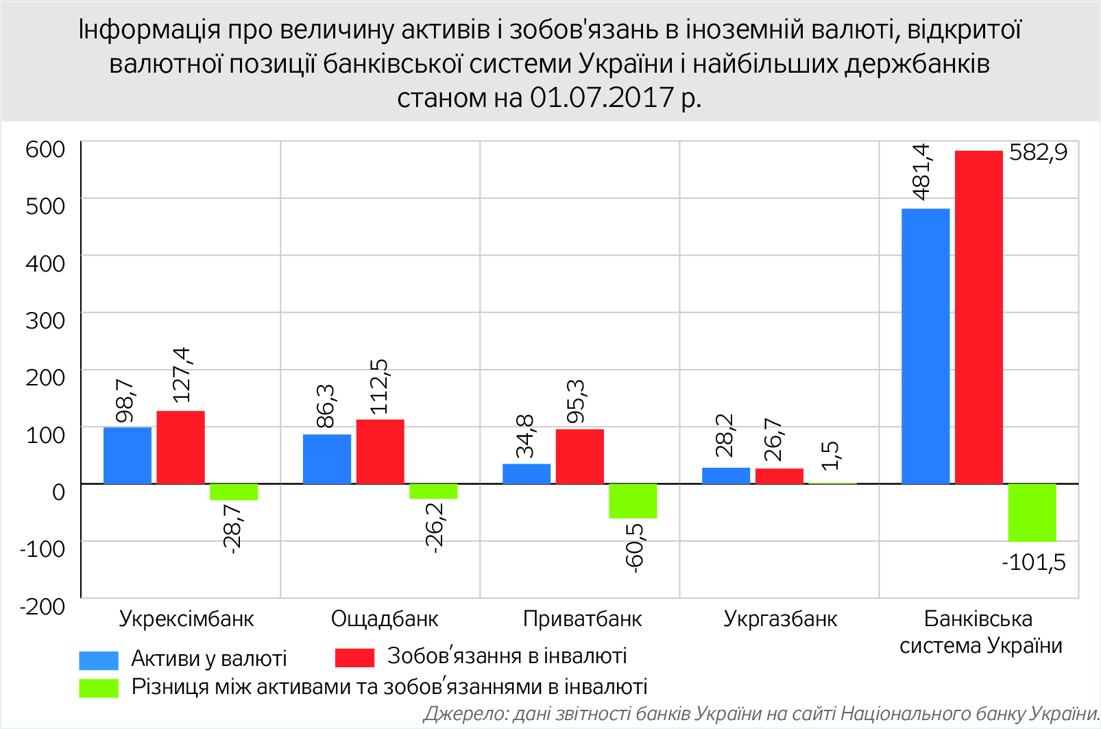 Величезний пласт проблем розкриває пункт рекомендацій ради НБУ, що пропонує оцінку реального валютного ризику, притаманного банківській системі України в перспективі не менш як трьох років, із позицій попиту на ключові валюти (долар США, євро) для закриття своїх валютних позицій. Як добре відомо не лише експертам, капітал українських банків не захищений від девальвації. І короткі валютні позиції (перевищення зобов'язань в іноземній валюті над валютними активами) загрожують не тільки потребами банківських установ у залученні кредитних коштів для покриття тимчасових касових розривів, а й докапіталізацією банків. Масштаб потенційної проблеми в розрізі банківської системи України і найбільших держбанків продемонстровано на рисунку.